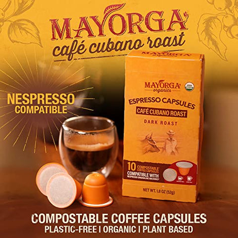 Details: Cubano Espresso Capsules ☕ Specialty Grade coffee. ♻️ Compostable. 🌱 Plant-based. 💚 Organic certified. 🌎 Good for the planet. ✅ Nespresso️ compatible. Café Cubano Roast is our signature blend. Made with specialty grade coffee, we use our signature Latin style, slow-roasting process to achieve a cuban-style profile by roasting coffees from Peru, Honduras and/or Nicaragua, providing a distinctly bold cup, with a sweet flavor, and smooth finish, making this cuban-style roast a Mayorga favorite. There are no contents originating from Cuba in this or any of our products.